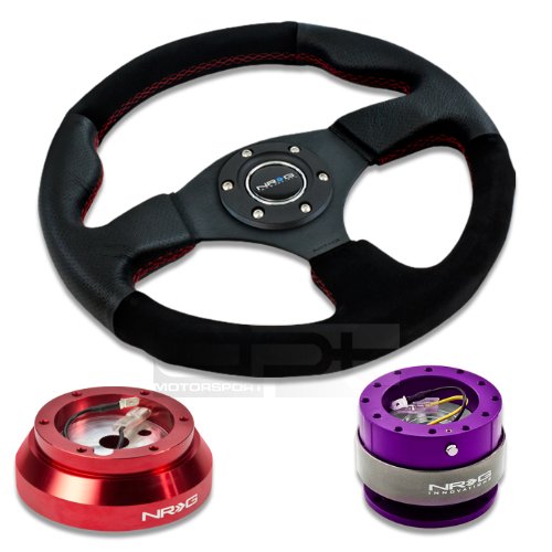 NRG-SRK-140H-RD+012R-S+200PP, NRG Innovations 12.5" 320mm Black Leather Red Stitch Suede Grip Racing Steering Wheel Combo with 6 Hole Short Hub Adapter with Gen 2.0 Purple Quick Release Kit SRK-140H