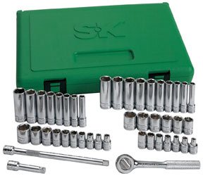 SK Hand Tool 44 pc. 1/4" Dr. 6-Point Fractional/Metric Socket Set SKT-91844SK Hand Tool 44 pc. 1/4' Dr. 6-Point Fractional/Metric Socket Set part #: SKT-91844 44 piece set is made in the U.S.A., featuring SK's high polish SuperKrome finish, which protects the tools from the harsh working environments found in today's workplace. Provides long life and maximum corrosion resistance. All sockets feature SK's patented SureGrip hex design, which drives the side of the fastener, not the corner, to avoid edge breakage which can occur on rusted or damaged fasteners when a traditional straight cornered hex tool is used. Set Contents: 4.5' Pro Ratchet; 2', 6' Extensions; 3/16', 7/32', 1/4', 9/32', 5/16', 11/32' 3/8', 7/16', 1/2', 9/16' Standard Sockets; 1/4', 9/32', 5/16', 11/32', 3/8', 7/16', 1/2', 9/16' Deep Sockets; 4mm, 5mm, 5.5mm, 6mm, 7mm, 8mm, 9mm, 10mm, 11mm, 12mm, 13mm, 14mm, 15mm Standard Sockets; 6mm, 7mm, 8mm, 9mm, 10mm, 11mm, 12mm, 13mm, 14mm, 15mm Deep Sockets. ? Packaged in a molded plastic case. Weight: 3.80 lbs.